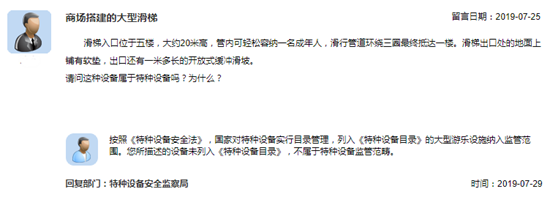 有網(wǎng)友于7月25日在國家市場(chǎng)監督管理總局網(wǎng)站公眾留言系統咨詢(xún)商場(chǎng)搭建的大型滑梯是否屬于特種設備,7月29日,市場(chǎng)監管總局特種設備安全監察局給予了答復。