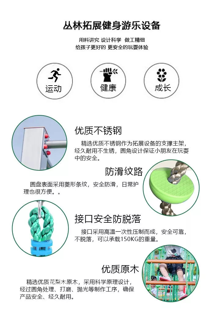 叢林拓展游樂(lè )設備是集爬繩、葫蘆盤(pán)爬、秋千繩、木頭爬、吊盤(pán)秋千、腰鼓爬繩、吊環(huán)、吊桿、網(wǎng)座秋千、鉆圈爬等功能為一體的綜合性游樂(lè )設備,能夠滿(mǎn)足現有幼兒園大部分的游樂(lè )、拓展、教學(xué)任務(wù),是作為幼兒園配套設施不可缺少的一部分。