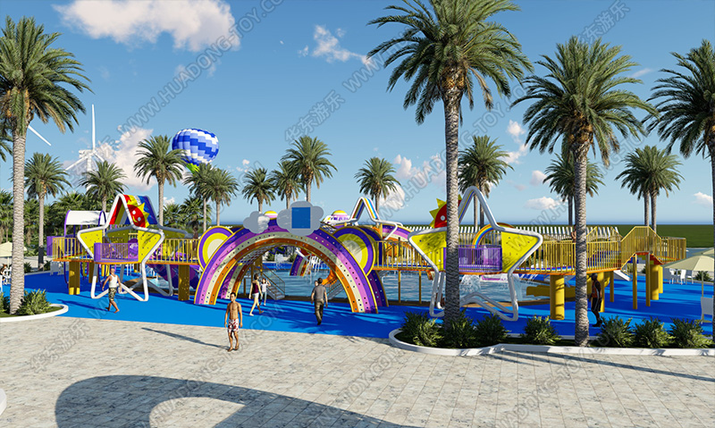 本案例設計靈感來(lái)源于天空中雨后的彩虹,這里充滿(mǎn)的彩虹世界的斑斕世界,有五顏六色的的彩虹滑梯、色彩斑斕的彩虹橋,小朋友可以在彩虹中盡情的戲耍打鬧,歡快的追逐天邊的繽紛彩虹,整個(gè)水上樂(lè )園充滿(mǎn)活潑奇特,色彩繽紛,在這里能夠游泳,能夠健身,讓孩子們在玩的過(guò)程中激發(fā)了想象力,提高勇于挑戰的勇氣和游玩帶來(lái)的歡樂(lè )!