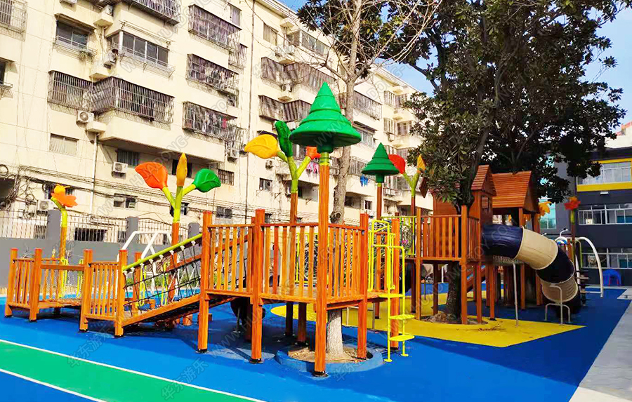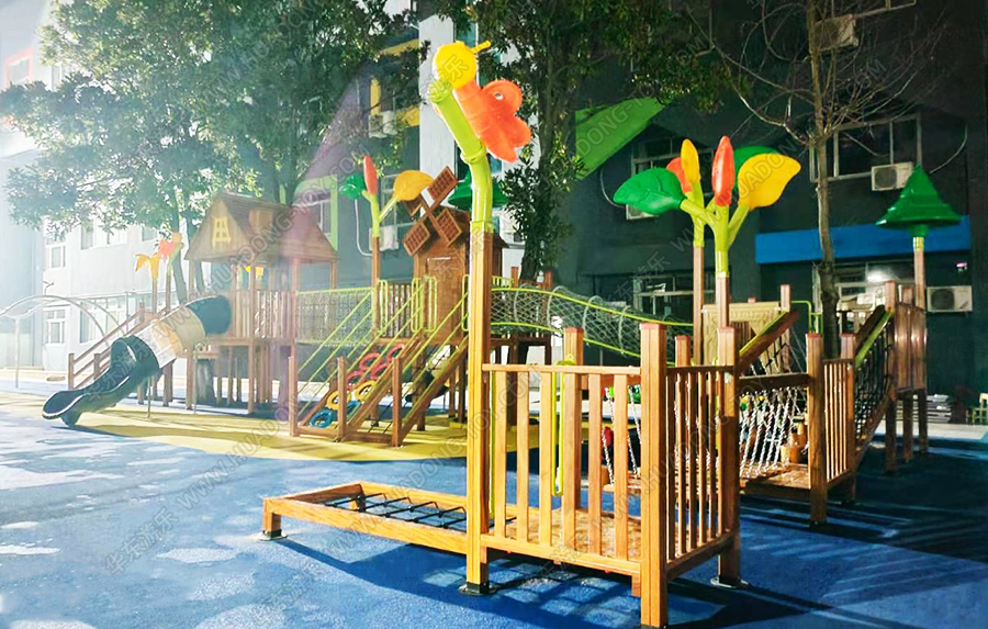 江蘇省泰興市育紅幼兒園城西分校是經(jīng)教育部批準的優(yōu)秀幼兒園,該幼兒園此次采用的是華東游樂(lè )生產(chǎn)的木制系列產(chǎn)品,具有爬網(wǎng)、攀爬、滑梯、腳踏水車(chē)、傳聲筒、鉆洞等游樂(lè )設施。
