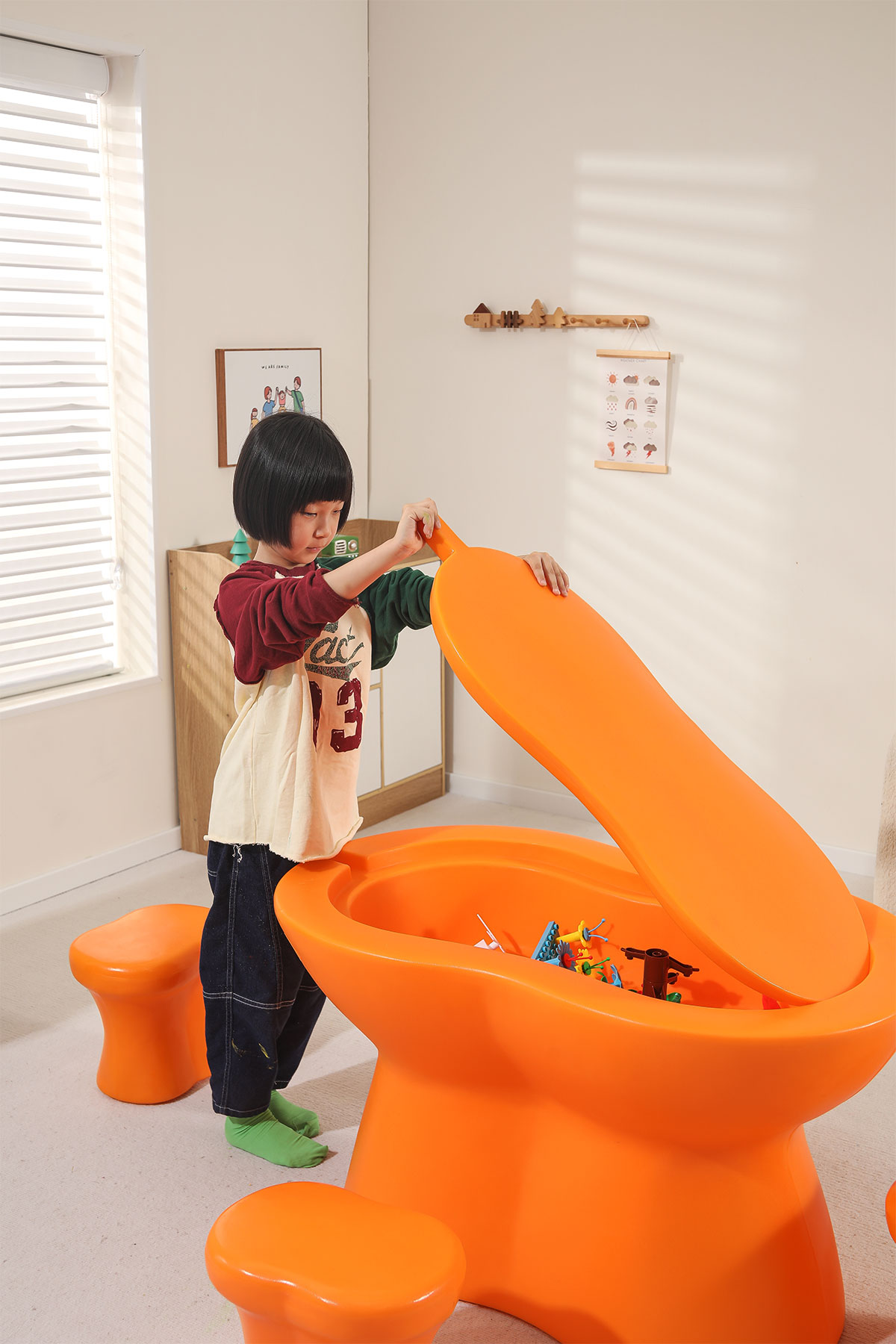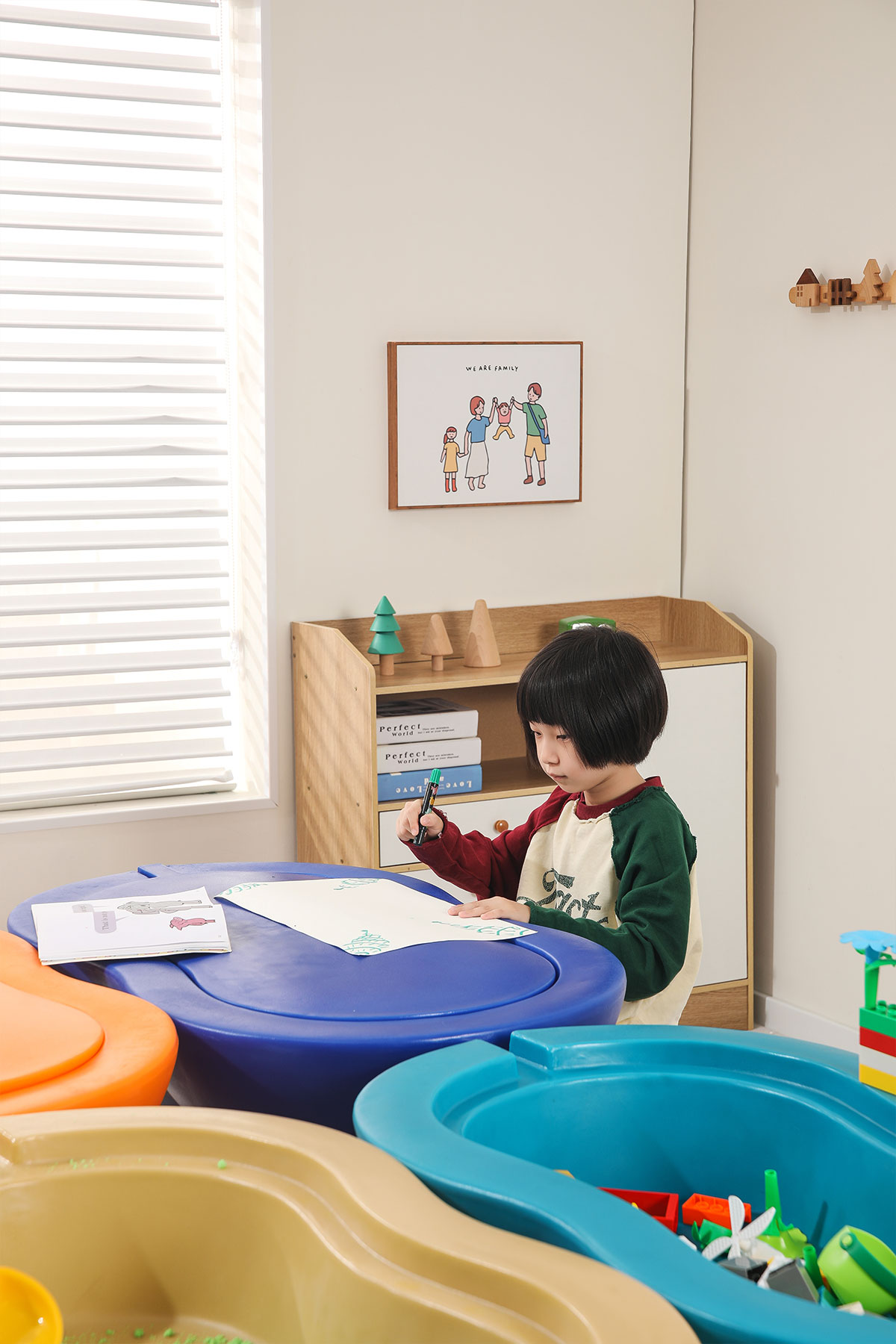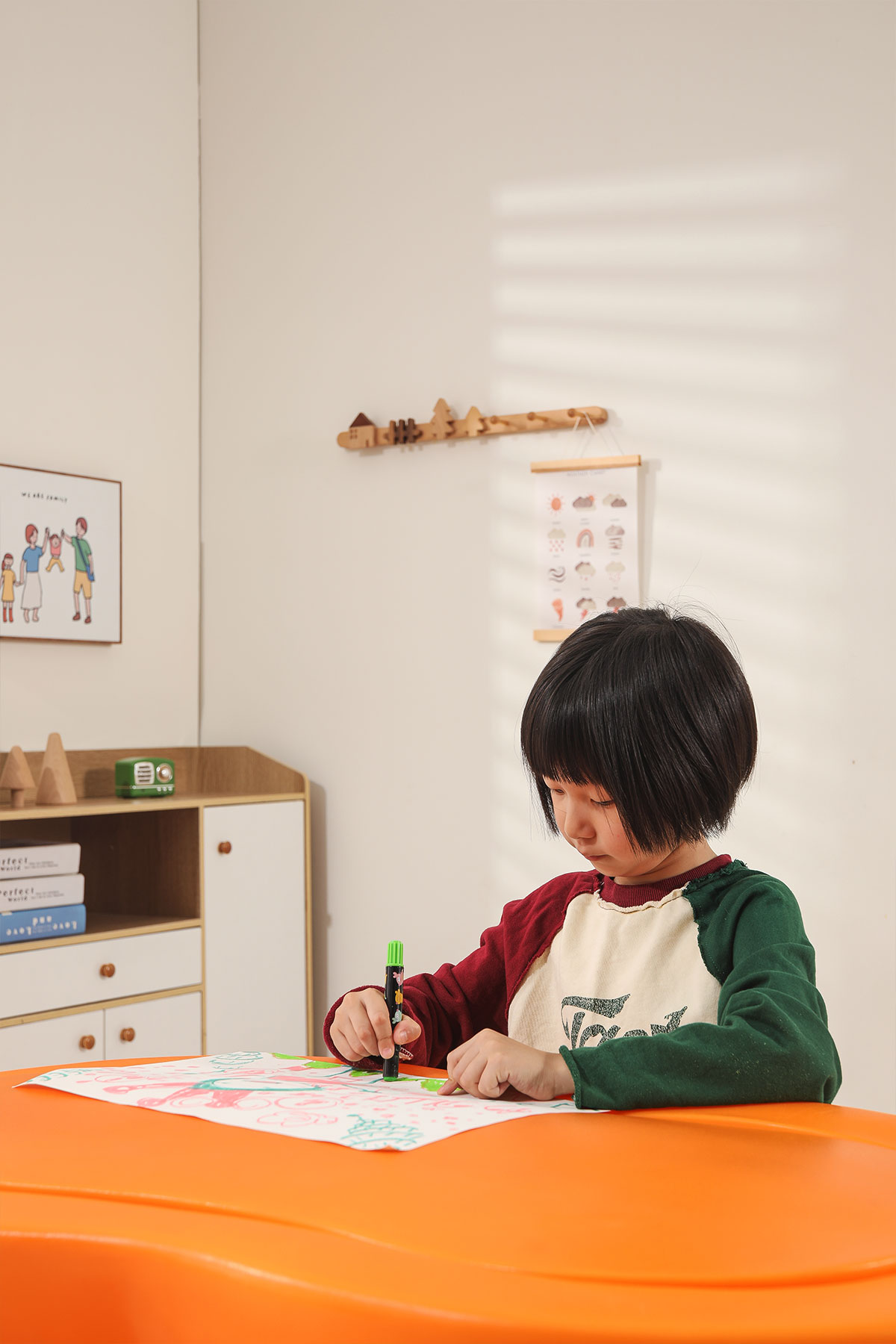 儲物柜的設計充分考慮了兒童的收納需求,柜內分隔合理,便于孩子分類(lèi)存放玩具和學(xué)習用品。同時(shí),柜子采用滑動(dòng)門(mén)設計,開(kāi)合順暢,安全可靠。