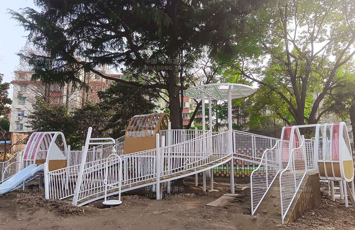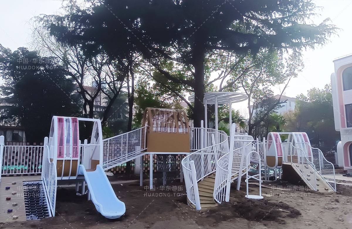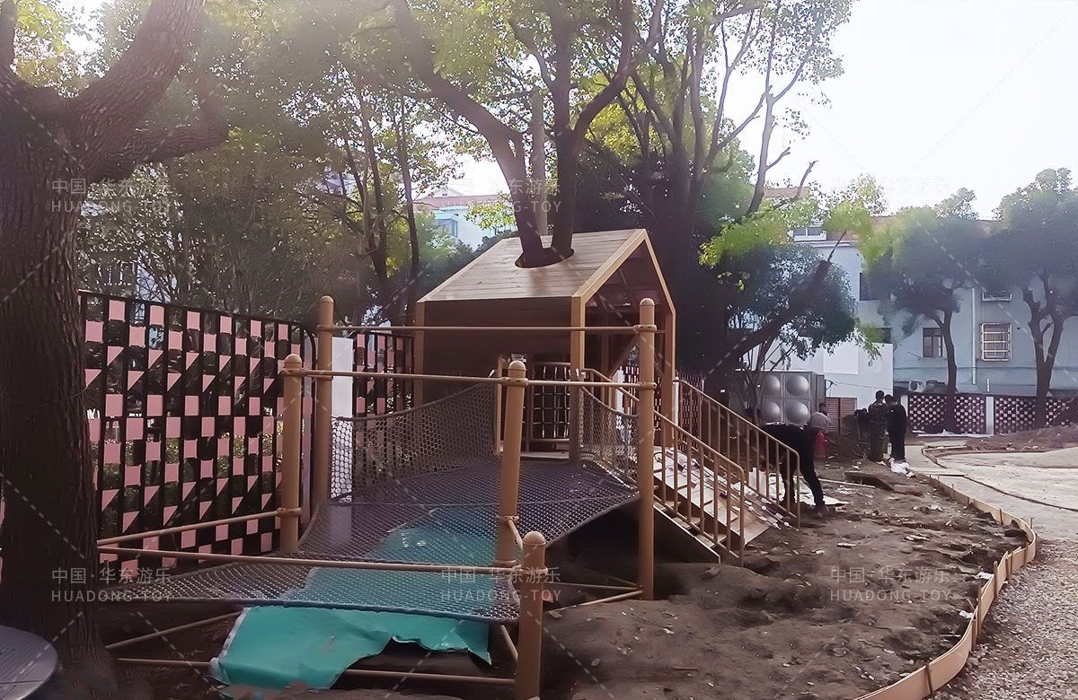 虹口區實(shí)驗幼兒園簡(jiǎn)介創(chuàng )建于1993年9月。1994年定為一級一類(lèi)幼兒園。兒園具有現代化的設施和美麗童趣的園舍??傉嫉孛娣e4800多平方米。建設面積3000多㎡。綠化面積1800多㎡。 此次幼兒園游樂(lè )項目選擇的是華東游樂(lè )自主研發(fā)和設計的一款綜合性木質(zhì)系列非標定制產(chǎn)品,不僅功能齊全,主體性也非常的適合幼兒園的場(chǎng)景設置。