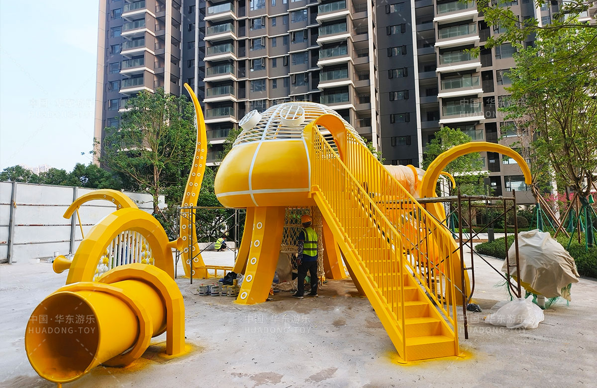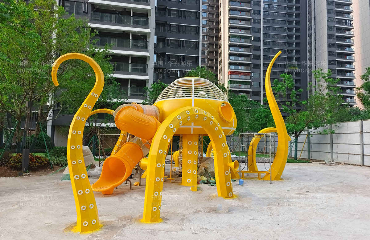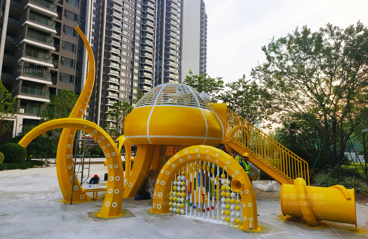 中海地產(chǎn)汕頭閱江府選用的是華東游樂(lè )自主研發(fā)和設計的以章魚(yú)為主題而設計的非標定制的章魚(yú)主題綜合游樂(lè )園,整個(gè)游樂(lè )園用一個(gè)大型的章魚(yú)設備為主題,設計了集鉆洞、攀爬網(wǎng)、滑梯、打擊樂(lè )器等功能為一體的綜合性游樂(lè )設備,為生活在當地的人群提供了一個(gè)休息娛樂(lè )的場(chǎng)所,也為小朋友們的健康成長(cháng)提供了保障。
